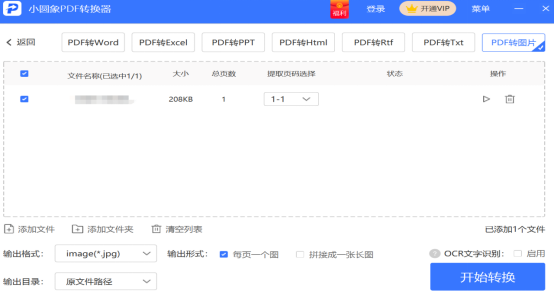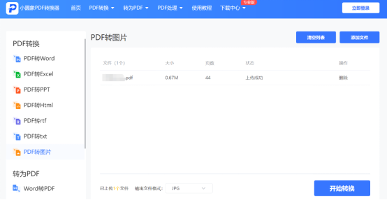 第三步:进入转换页面后,我们需要选择上方的PDF转图片的功能,然后点击空白处并上传文件,文件上传完毕后,其它的选项可以默认设置,不需要进行修改,然后点击开始转换,整个过程非常快,马上我们就可以得到转换出来的JPG图片了!