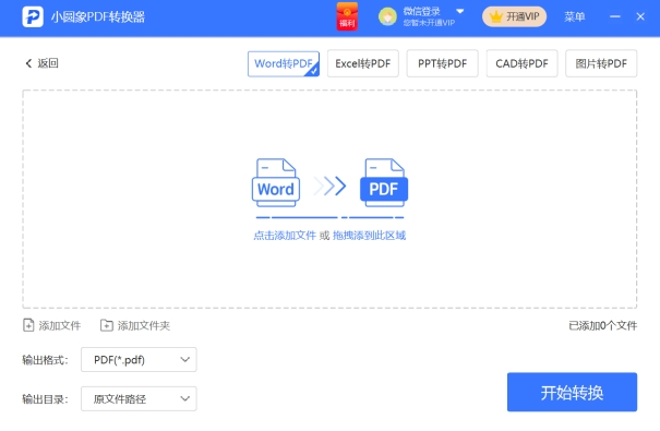 点击进入后,小圆象PDF转换器会跳出如下页面,接下来的流程相信大家看到这一页面后基本都会操作了。其实很简单,只要你点击添加好word文件,然后直接就可以点击右下角的【开始转换】了。