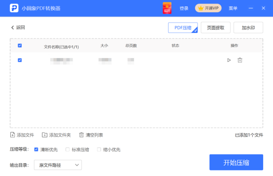 第二步:选择上方的【PDF压缩】,添加需要进行压缩的PDF文件,而后选择压缩等级,再点击开始压缩就可以了!