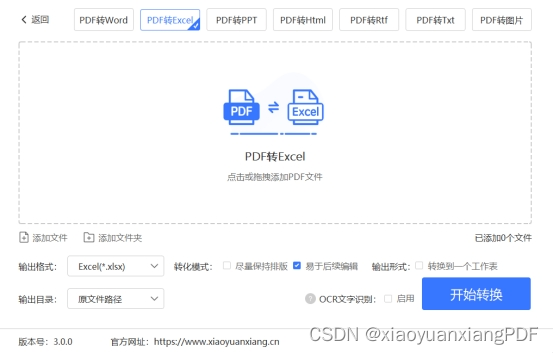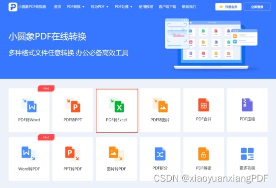 小圆象PDF转换器是一款支持在线转换文件格式的软件,它可以将PDF文档转换为各种格式,包括Excel表格。你可以在官网首页找到小圆象的各种转换服务,包括PDF转Word、PPT、图片等功能。点击【PDF转Excel】服务,选择上传你的PDF文档,并勾选一些选项。