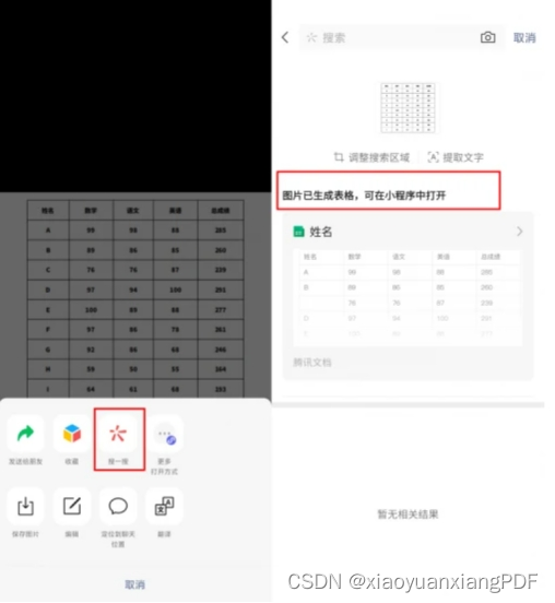 市面上有一些识别软件能够帮助我们识别图片中的数据,并将其转换为Excel表格。因此,我们可以将PDF表格截图或拍照下来,再用识别软件识别数据。如果没有识别工具,也没关系。我们可以使用微信或QQ来实现。首先,在微信聊天框中将图片发送出去,打开该图片,长按后会显示【搜一搜】,点击后微信就会开始自动识别文字。