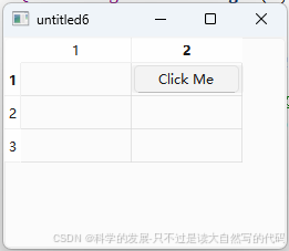 在这个示例中,我们在 QTableWidget 的第 1 行第 1 列放置了一个 QPushButton。当用户点击这个按钮时,它会像普通的按钮一样响应点击事件。