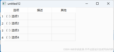 另外,请注意,在这个示例中,所有的单选按钮都是独立的,它们之间并没有形成互斥组。如果你想要让某一列或某几列的单选按钮形成互斥组,你需要手动将它们添加到同一个 QButtonGroup 中。QButtonGroup 可以管理一组互斥的单选按钮,确保在同一组内只有一个按钮可以被选中。
