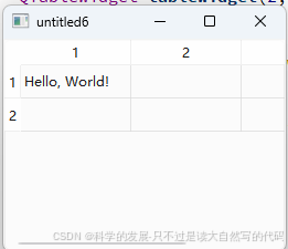 在这个示例中,我们创建了一个 QTableWidget,然后在其第 0 行第 0 列添加了一个包含文本 "Hello, World!" 的 QTableWidgetItem。最后,我们显示了表格控件。