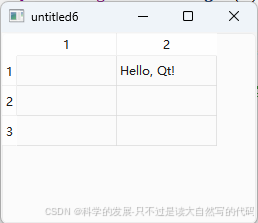 在这个示例中,我们创建了一个 3 行 2 列的 QTableWidget,然后在第 1 行第 1 列(索引从 0 开始)设置了一个包含文本 "Hello, Qt!" 的 QTableWidgetItem。最后,我们显示了这个表格控件。