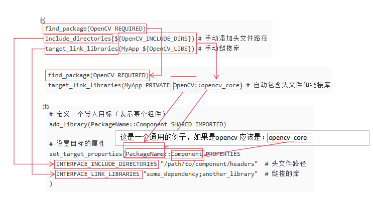 find_package(OpenCV REQUIRED) target_link_libraries(MyApp PRIVATE OpenCV::opencv_core) # 自动包含头文件和链接库- 此时不需要