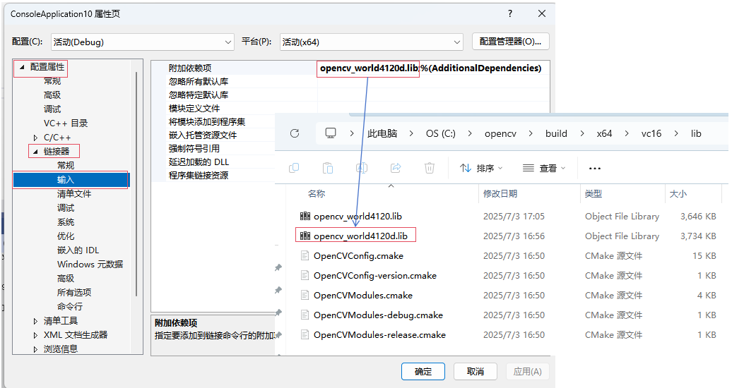 opencv_world460d.lib(版本号可能因OpenCV版本不同而有所变化);在Release模式下,可能需要添加opencv_world460.lib。