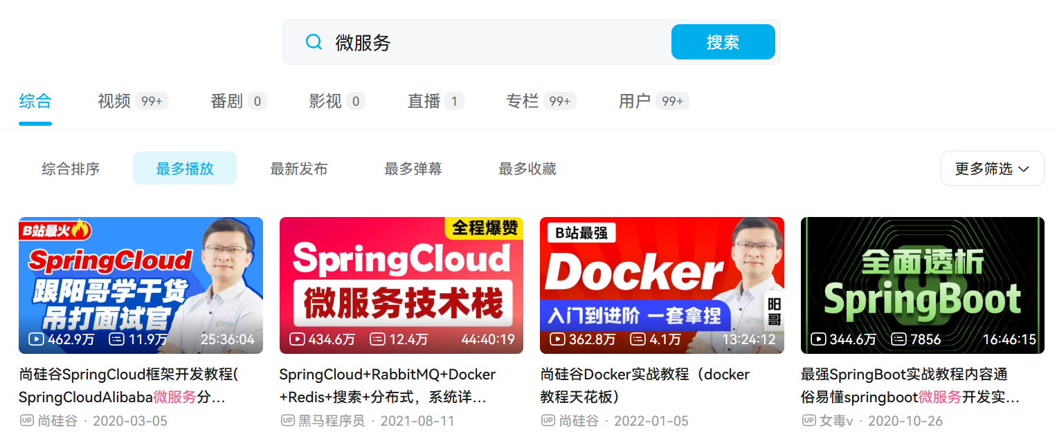 你猜一下,这个用“微服务”这个关键词,在 B 站搜索,然后按照播放量排序,播放量第一有多少,前四加起来又有多少?