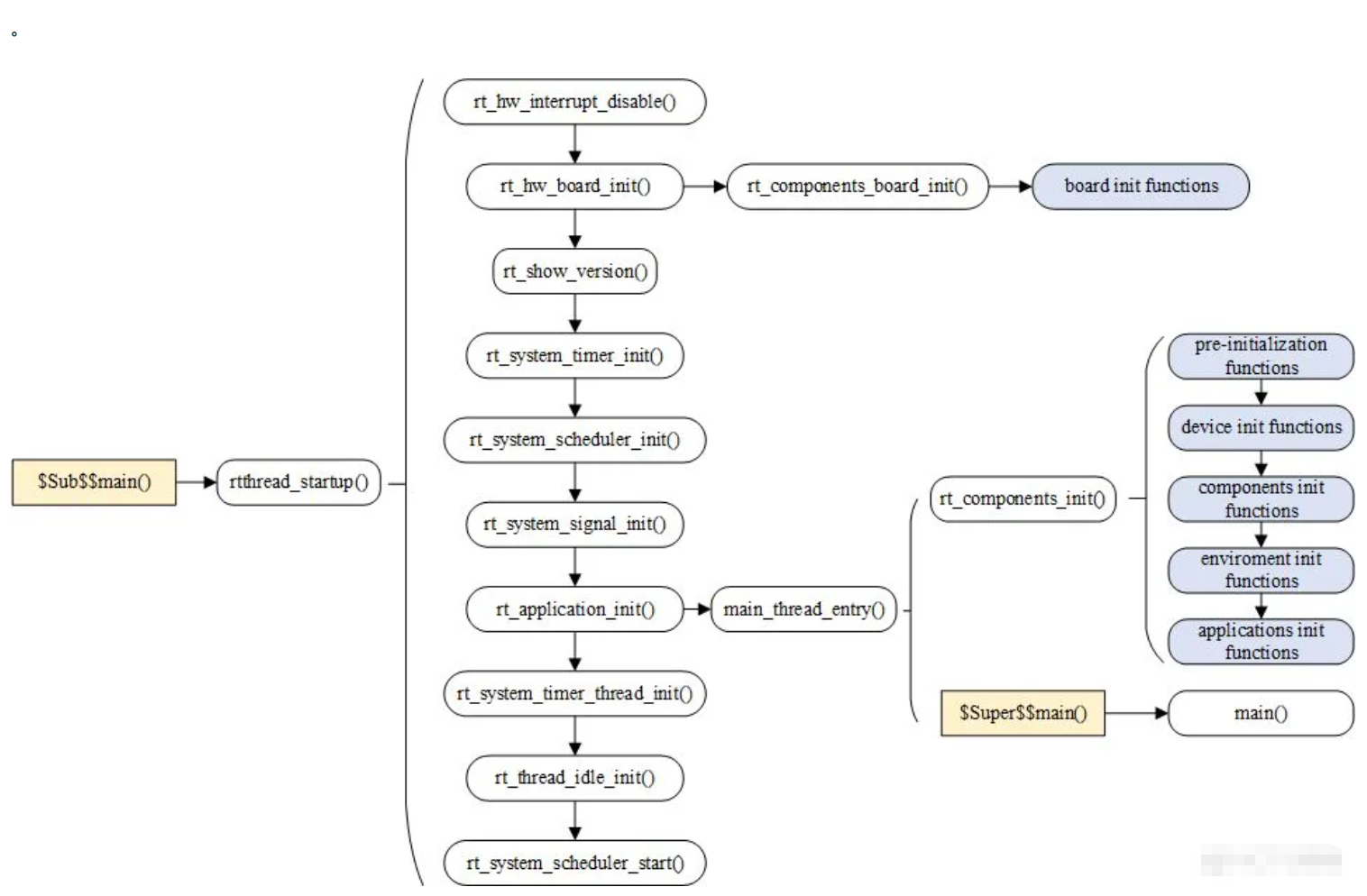 那么上面提到,在启动流程中,调用了两个函数rt_components_board_init()与rt_components_init()就完成了6部分的初始化。从启动流程图中可以看出: