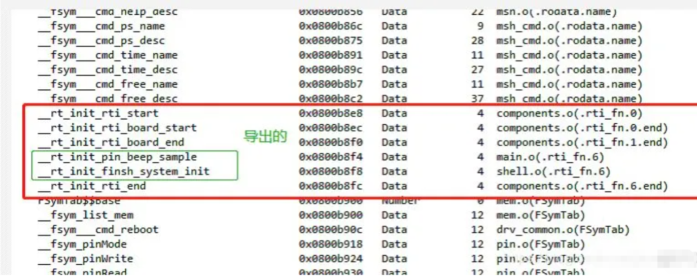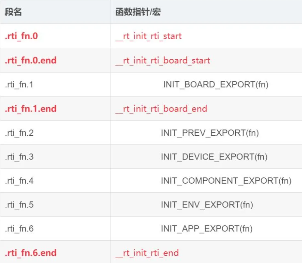 可以看出,这4个空函数所导出的段中间,包含着这6个初始化宏定义的段,而这6个段中分别包含着各自宏导出函数时的函数指针。rt_components_board_init()完成了第 1 段,rt_components_init()完成了第2 到第6 段。