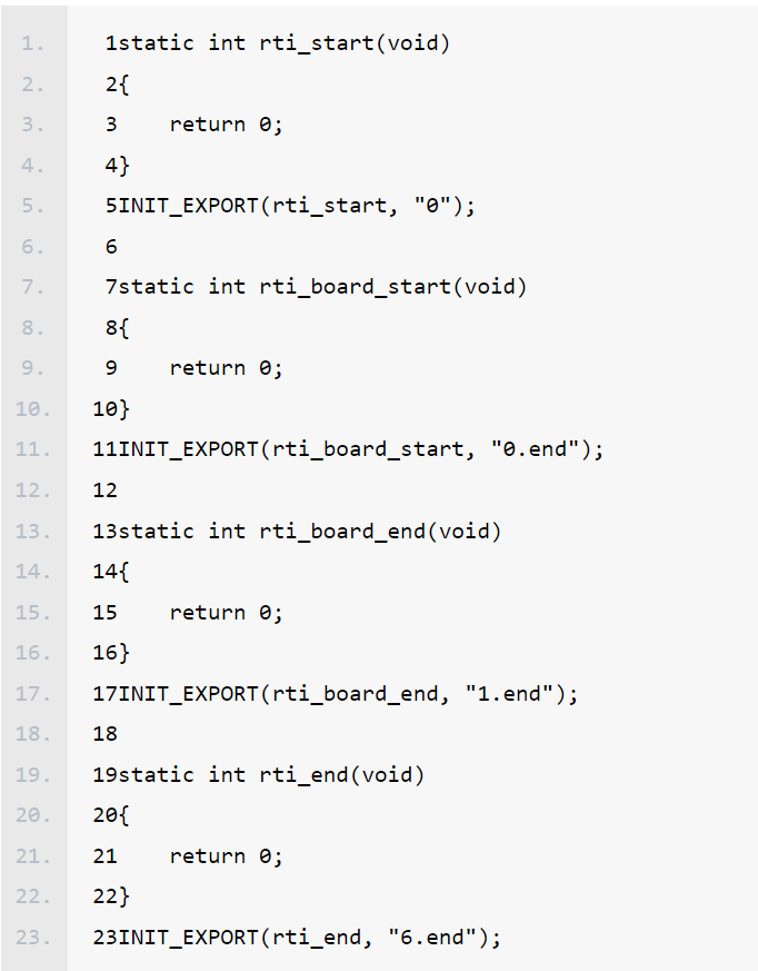 以上就是整个的宏定义,作用就是将函数 fn 的地址赋给一个 __rt_init_fn 的指针,然后放入相应 level 的数据段中。所以函数使用自动初始化宏导出后,这些数据段中就会存储指向各个初始化函数的指针。