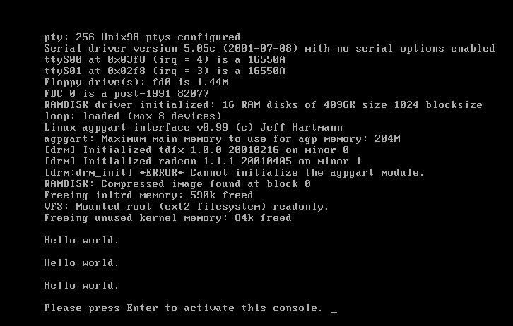 这样就将linux2.4.20内核和文件系统集成到一张软盘上了,现在我们就拥有了一张可以自激活到Linux环境的软盘。对于本例来讲,想要执行一个helloworld程序,只要将helloworld这个可执行文件复制到 /bin目录就可以了。我们可以在“使用BusyBox制作常用命令“这个阶段来完成它.