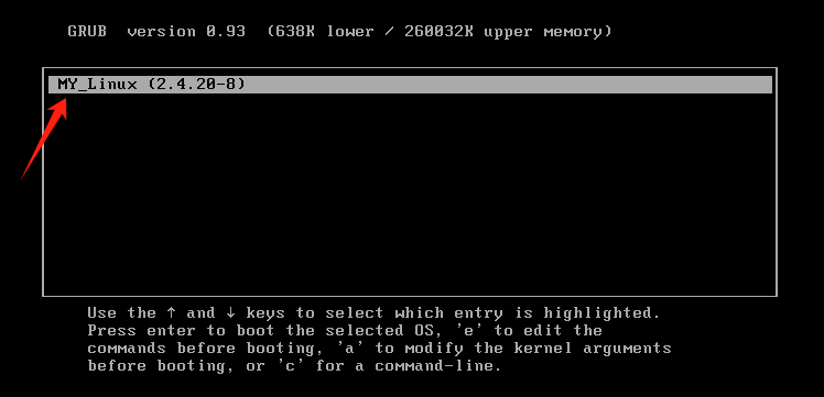 # kernel /vmlinuz-version ro root=/dev/sda2