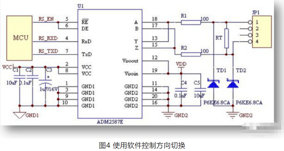 市面上大部分的内置RS485的产品基本都是采用此类的方案,如下图4中的RS_EN引脚。具体的 实现方式是:在空闲器件,RS_EN为低电平,MCU处于接收状态,在准备发送数据之前,MCU会拉高RS_EN,U1处于发送状态,发送完毕之后,RS_EN重新处于低电平,U1处于接收状态。