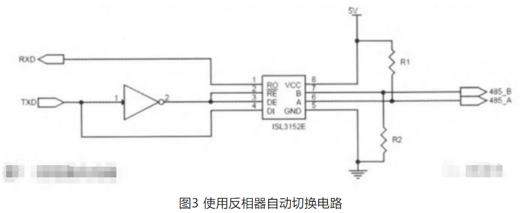大部分的低成本RS232-RS485转换器采用了这种方法。具体的实现方法是:把串口的发送信号TX作为反相器的输入,反相器的输出则用来控制RS485收发器的收发控制引脚,同时在RS485收发器的A/B输出端加上上拉/下拉电阻,具体电路如图3所示。