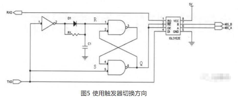 为了克服反相器换向的缺点,出现了一种由RS触发器控制的自动换向技术,如图5所示。这个电路的关键是反相器和RS触发器之间的由二极管、电阻、电容组成的充放电电路。在空闲状态下,485芯片仍处于接收状态。当TXD信号线上发送数据的低电平起始位时,反相器输出高电平,通过二极管为电容迅速充电,使RS触发器R端为高电平,S端为低电平,触发器输出高电平,把ISL3152E置于发送状态;当TXD信号线转换为高电平时,反相器输出低电平,电容通过电阻缓慢放电,使得R端暂时仍处于高电平状态,加上S端的高电平状态,使触发器的输出保持前面的高电平状态,485芯片仍处于发送状态。电容经过一段时间放电后,R端电压转变为低电平,则触发器输出低电平,把485芯片置回接收状态。通过选择电阻和电容值,我们可以控制放电速度,使得一个低电平的起始位足以在整个字节发送。此类方案参数一致性非常差,实际使用的都是技高人胆大的。