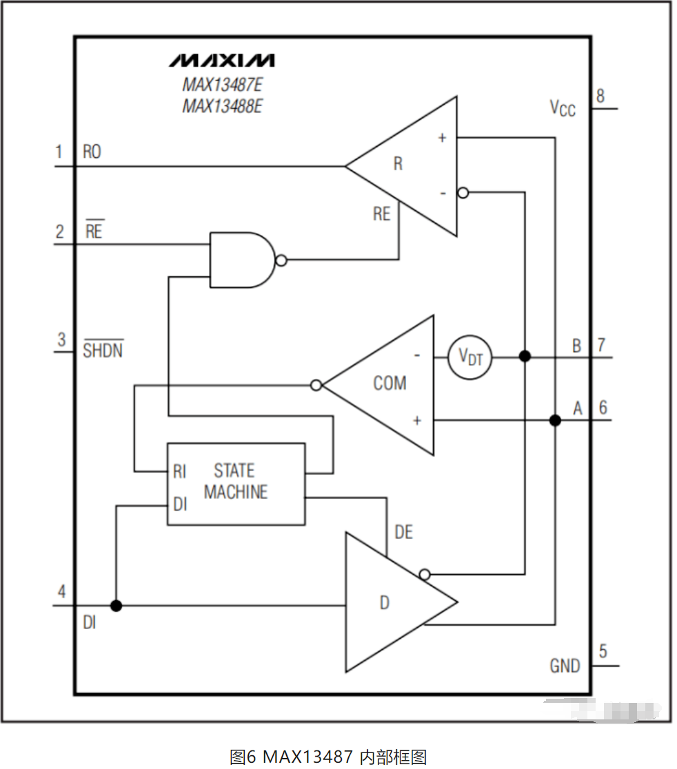 为了克服软件参与的方向控制不确定性,美信公司发布了宣称首款支持芯片自动换向的RS485芯片,如下图6,对比其他的RS485芯片,MAX16487的/RE引脚有两个作用: