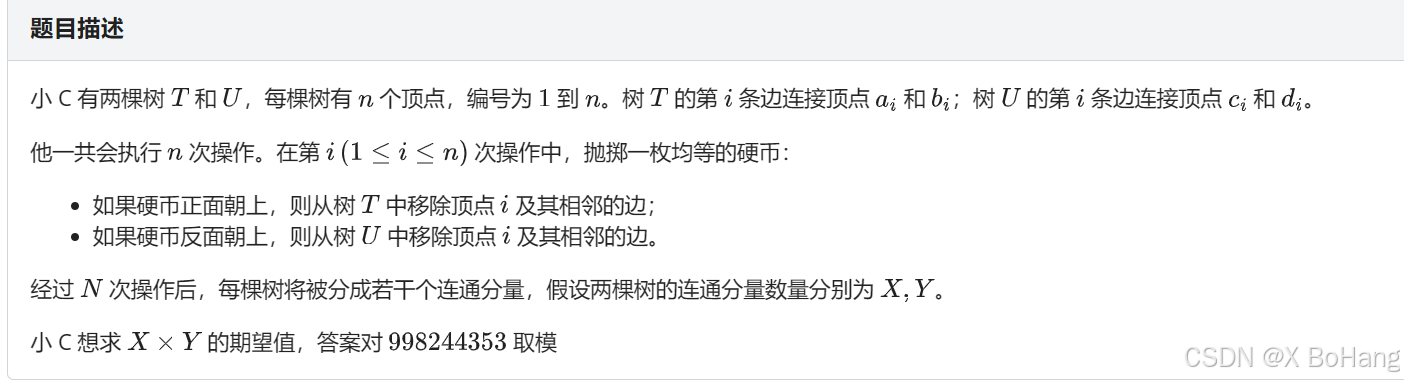 我们先以边*边为例,对于树T的边(u,v)假设它被保留(概率为1/4),那么树U中u,v必定被删除。计算树U中有多少条边(x,y)不以u或v为端点。计算每条边(x,y)都有1/4的概率被保留。