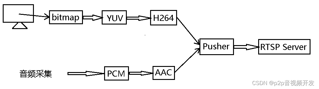 实时录屏并把视频推流到RTSP服务器,具体流程是抓取屏幕内容(bitmap),并把bitmap转化为YUV,接着把YUV编码成H264,再把H264码流推到RTSP服务器;把采集到的PCM编码为AAC,再把AAC推流至RTSP服务器。