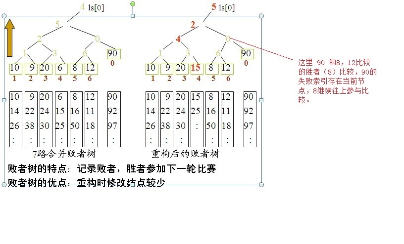 注意,败者树的重构跟胜者树是不一样的,败者树的重构只需要与其父结点比较。
