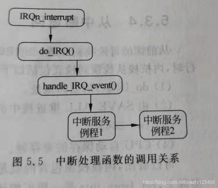 用IRQn_interrupt表示从IRQ0x00_interrupt到IRQ0x0f_interrupt的任意一个中断处理程序。这个中断处理程序调用do_IRQ()函数。do_IRQ()对所接收的中断进行应答,并禁止这条中断线,然后要确保这条中断线上有一个有效的中断服务程序,而且这个例程已经启动但目前还没有执行。这时,do_IRQ()调用handle_IRQ_event()来运行挂在这条中断线上的所有中断服务程序。其调用关系如图所示: