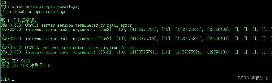 | Fri Nov 25 11:24:53 2022 alter database open Beginning crash recovery of 1 threads parallel recovery started with 15 processes Started redo scan Completed redo scan read 900 KB redo, 386 data blocks need recovery Started redo application at Thread 1: logseq 93214, block 60163 Recovery of Online Redo Log: Thread 1 Group 1 Seq 93214 Reading mem 0 Mem# 0: D:\APP\ADMINISTRATOR\ORADATA\XFF\REDO01.LOG Completed redo application of 0.46MB Fri Nov 25 11:25:02 2022 Hex dump of (file 3, block 208) in trace file D:\APP\ADMINISTRATOR\diag\rdbms\XFF\XFF\trace\XFF_p004_1988.trc Reading datafile 'D:\APP\ADMINISTRATOR\ORADATA\XFF\UNDOTBS01.DBF' for corruption at rdba: 0x00c000d0 (file 3, block 208) Reread (file 3, block 208) found valid data Hex dump of (file 3, block 208) in trace file D:\APP\ADMINISTRATOR\diag\rdbms\XFF\XFF\trace\XFF_p004_1988.trc Repaired corruption at (file 3, block 208) Hex dump of (file 3, block 152) in trace file D:\APP\ADMINISTRATOR\diag\rdbms\XFF\XFF\trace\XFF_p004_1988.trc Reading datafile 'D:\APP\ADMINISTRATOR\ORADATA\XFF\UNDOTBS01.DBF' for corruption at rdba: 0x00c00098 (file 3, block 152) Reread (file 3, block 152) found same corrupt data (logically corrupt) RECOVERY OF THREAD 1 STUCK AT BLOCK 152 OF FILE 3 Fri Nov 25 11:25:02 2022 Hex dump of (file 3, block 6859) in trace file D:\APP\ADMINISTRATOR\diag\rdbms\XFF\XFF\trace\XFF_p001_19268.trc Reading datafile 'D:\APP\ADMINISTRATOR\ORADATA\XFF\UNDOTBS01.DBF' for corruption at rdba: 0x00c01acb (file 3, block 6859) Reread (file 3, block 6859) found same corrupt data (logically corrupt) Fri Nov 25 11:25:13 2022 Errors in file D:\APP\ADMINISTRATOR\diag\rdbms\XFF\XFF\trace\XFF_p010_7024.trc (incident=224379): ORA-07445: 出现异常错误: 核心转储 [kdxlin()+4432] [ACCESS_VIOLATION] [ADDR:0xC] [PC:0x14306B54A] [UNABLE_TO_READ] [] Incident details in: D:\APP\ADMINISTRATOR\diag\rdbms\XFF\XFF\incident\incdir_224379\XFF_p010_7024_i224379.trc Use ADRCI or Support Workbench to package the incident. See Note 411.1 at My Oracle Support for error and packaging details. Fri Nov 25 11:25:13 2022 Errors in file D:\APP\ADMINISTRATOR\diag\rdbms\XFF\XFF\trace\XFF_p005_12036.trc (incident=224343): ORA-07445: 出现异常错误: 核心转储 [kdxlin()+4432] [ACCESS_VIOLATION] [ADDR:0xC] [PC:0x14306B54A] [UNABLE_TO_READ] [] Incident details in: D:\APP\ADMINISTRATOR\diag\rdbms\XFF\XFF\incident\incdir_224343\XFF_p005_12036_i224343.trc Use ADRCI or Support Workbench to package the incident. See Note 411.1 at My Oracle Support for error and packaging details. Fri Nov 25 11:25:18 2022 Sweep [inc][224379]: completed Sweep [inc][224343]: completed Sweep [inc2][224379]: completed Sweep [inc2][224343]: completed RECOVERY OF THREAD 1 STUCK AT BLOCK 6859 OF FILE 3 Fri Nov 25 11:25:33 2022 Slave exiting with ORA-1172 exception Errors in file D:\APP\ADMINISTRATOR\diag\rdbms\XFF\XFF\trace\XFF_p004_1988.trc: ORA-01172: 线程 1 的恢复停止在块 152 (在文件 3 中) ORA-01151: 如果需要, 请使用介质恢复以恢复块和还原备份 Fri Nov 25 11:25:34 2022 Errors in file D:\APP\ADMINISTRATOR\diag\rdbms\XFF\XFF\trace\XFF_p001_19268.trc: ORA-10388: parallel query server interrupt (failure) Errors in file D:\APP\ADMINISTRATOR\diag\rdbms\XFF\XFF\trace\XFF_p001_19268.trc: ORA-10388: parallel query server interrupt (failure) Fri Nov 25 11:25:38 2022 Errors in file D:\APP\ADMINISTRATOR\diag\rdbms\XFF\XFF\trace\XFF_p010_7024.trc: ORA-00742: 日志读取在线程 %d 序列 %d 块 %d 中检测到写入丢失情况 ORA-00312: 联机日志 1 线程 1: 'D:\APP\ADMINISTRATOR\ORADATA\XFF\REDO01.LOG' ORA-00607: 当更改数据块时出现内部错误 ORA-00602: 内部编程异常错误 ORA-07445: 出现异常错误: 核心转储 [kdxlin()+4432] [ACCESS_VIOLATION] [ADDR:0xC] [PC:0x14306B54A] [UNABLE_TO_READ] [] Fri Nov 25 11:25:41 2022 Errors in file D:\APP\ADMINISTRATOR\diag\rdbms\XFF\XFF\trace\XFF_p005_12036.trc (incident=224344): ORA-01578: ORACLE 数据块损坏 (文件号 27, 块号 520567) ORA-01110: 数据文件 27: 'D:\APP\ADMINISTRATOR\PRODUCT\11.2.0\DBHOME_1\DATABASE\POWERMPP.DBF' ORA-10564: tablespace POWERMPP ORA-01110: 数据文件 27: 'D:\APP\ADMINISTRATOR\PRODUCT\11.2.0\DBHOME_1\DATABASE\POWERMPP.DBF' ORA-10561: block type 'TRANSACTION MANAGED INDEX BLOCK', data object# 89776 ORA-00607: 当更改数据块时出现内部错误 ORA-00602: 内部编程异常错误 ORA-07445: 出现异常错误: 核心转储 [kdxlin()+4432] [ACCESS_VIOLATION] [ADDR:0xC] [PC:0x14306B54A] [UNABLE_TO_READ] [] Incident details in: D:\APP\ADMINISTRATOR\diag\rdbms\XFF\XFF\incident\incdir_224344\XFF_p005_12036_i224344.trc Errors in file D:\APP\ADMINISTRATOR\diag\rdbms\XFF\XFF\trace\XFF_p005_12036.trc: ORA-01578: ORACLE 数据块损坏 (文件号 27, 块号 520567) ORA-01110: 数据文件 27: 'D:\APP\ADMINISTRATOR\PRODUCT\11.2.0\DBHOME_1\DATABASE\POWERMPP.DBF' ORA-10564: tablespace POWERMPP ORA-01110: 数据文件 27: 'D:\APP\ADMINISTRATOR\PRODUCT\11.2.0\DBHOME_1\DATABASE\POWERMPP.DBF' ORA-10561: block type 'TRANSACTION MANAGED INDEX BLOCK', data object# 89776 ORA-00607: 当更改数据块时出现内部错误 ORA-00602: 内部编程异常错误 ORA-07445: 出现异常错误: 核心转储 [kdxlin()+4432] [ACCESS_VIOLATION] [ADDR:0xC] [PC:0x14306B54A] [UNABLE_TO_READ] [] Errors in file D:\APP\ADMINISTRATOR\diag\rdbms\XFF\XFF\trace\XFF_p010_7024.trc (incident=224380): ORA-01578: ORACLE 数据块损坏 (文件号 26, 块号 227101) ORA-01110: 数据文件 26: 'D:\APP\ADMINISTRATOR\PRODUCT\11.2.0\DBHOME_1\DATABASE\POWERMSP.DBF' ORA-10564: tablespace POWERMSP ORA-01110: 数据文件 26: 'D:\APP\ADMINISTRATOR\PRODUCT\11.2.0\DBHOME_1\DATABASE\POWERMSP.DBF' ORA-10561: block type 'TRANSACTION MANAGED INDEX BLOCK', data object# 99375 ORA-00607: 当更改数据块时出现内部错误 ORA-00602: 内部编程异常错误 ORA-07445: 出现异常错误: 核心转储 [kdxlin()+4432] [ACCESS_VIOLATION] [ADDR:0xC] [PC:0x14306B54A] [UNABLE_TO_READ] [] Fri Nov 25 11:25:51 2022 Incident details 