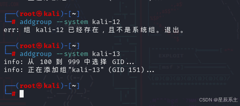 addgroup --system 组名 addgroup --system kali-13这个命令会创建一个名为 组名 的系统组。系统组通常用于系统服务和进程,它们的 GID 通常小于 1000。
