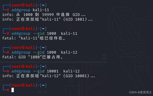addgroup --gid 1000 组名 addgroup --gid 10001 kali-12这个命令会创建一个名为 组名 的组,并指定其 GID 为 1000。