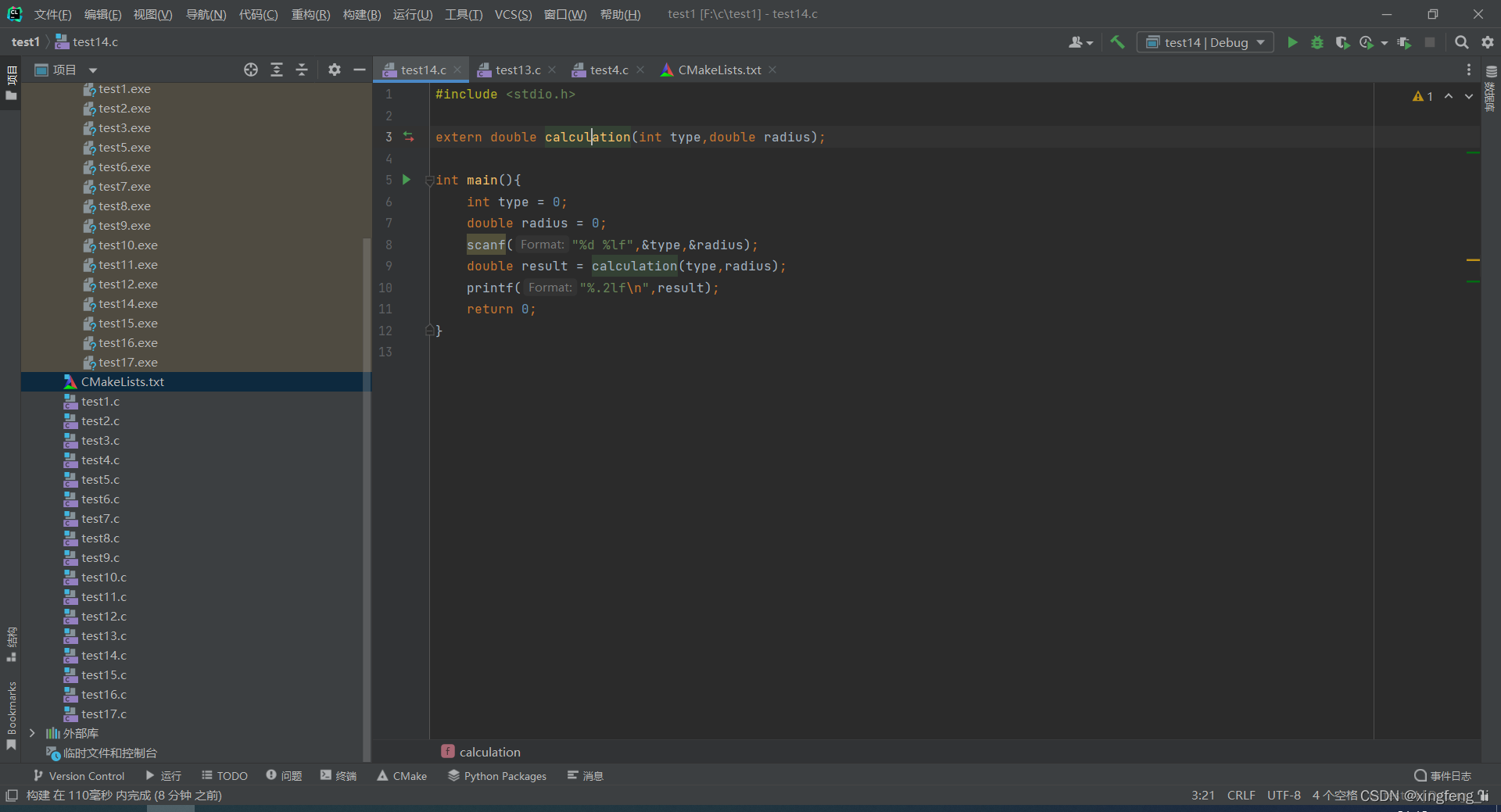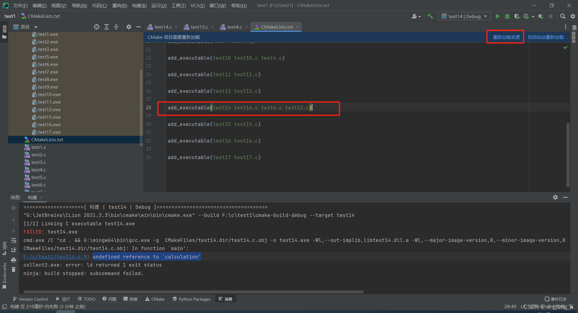 5.在CMakeLists.txt文件add_executable(test14 test14.c),加上test4.c和test13.c,中间用空格隔开,添加完成后,点击“重新加载变更”;