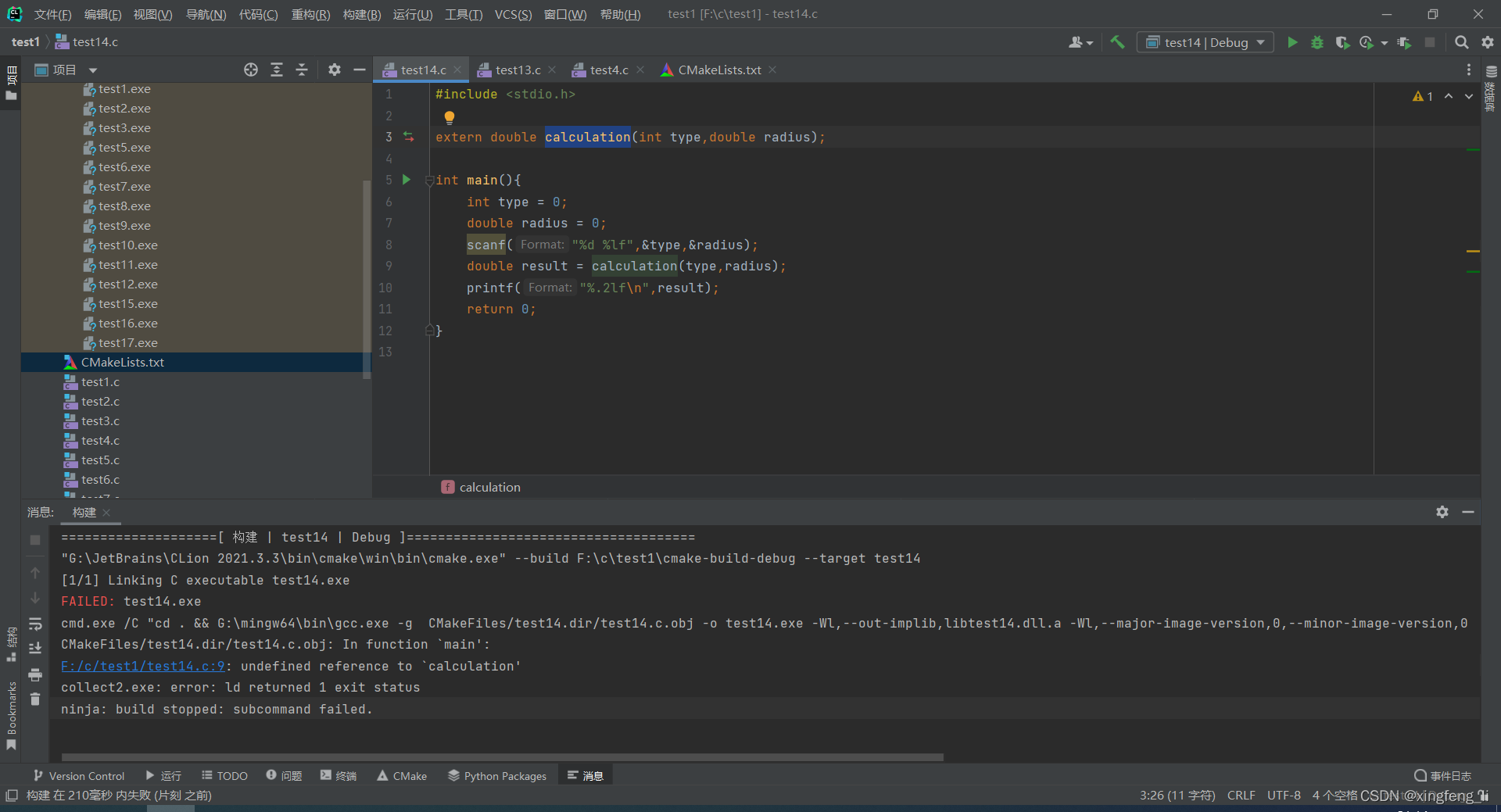 4,运行test14.c,会报“undefined reference to `calculation'”,找不到这个函数。