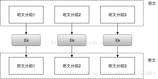 当我们有一段明文,需要对其进行AES加密时,需要对明文进行分组,分组长度可为128,256,或512bits。采用ECB模式的分组密码算法加密过程如下图: