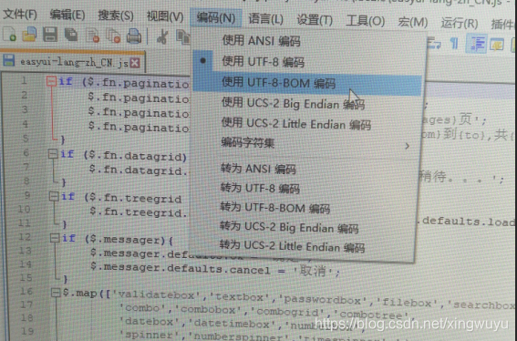 将easyui-lang-zh_CN.js 文件用Notepad++打开,将编码格式修改为utf-8-bom 就可以了