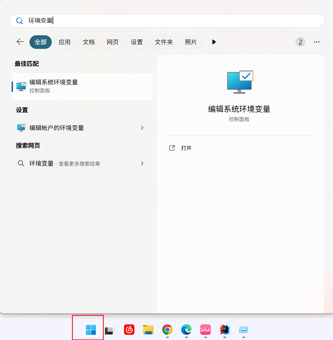 1.按下键盘的win键,输入环境变量,并且点击编辑系统环境变量
