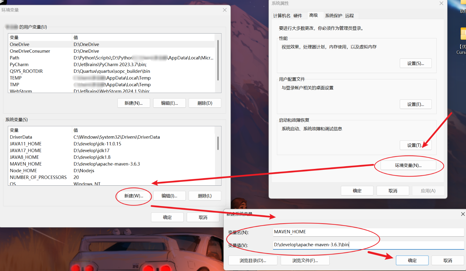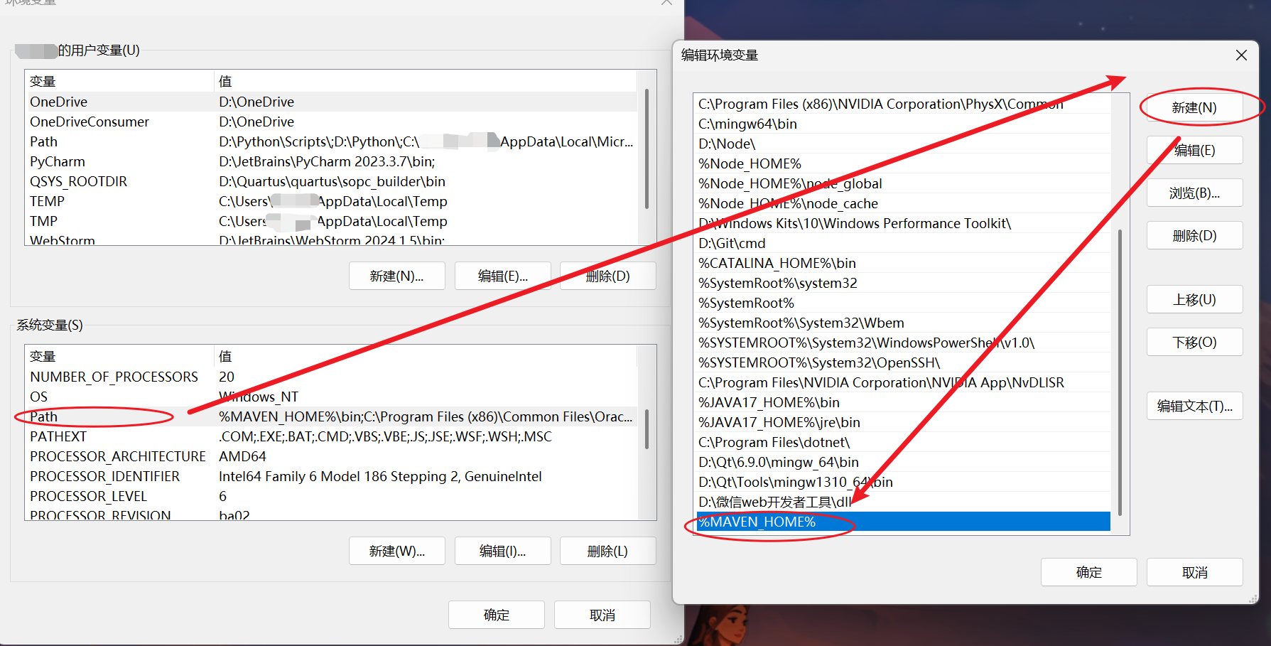 3.新建maven变量,按照下图所示箭头顺序,逐个点击,在新建的弹窗中,输入变量名为MAVEN_HOME,变量值为我们刚才解压后maven文件的bin路径的位置,点击确定。