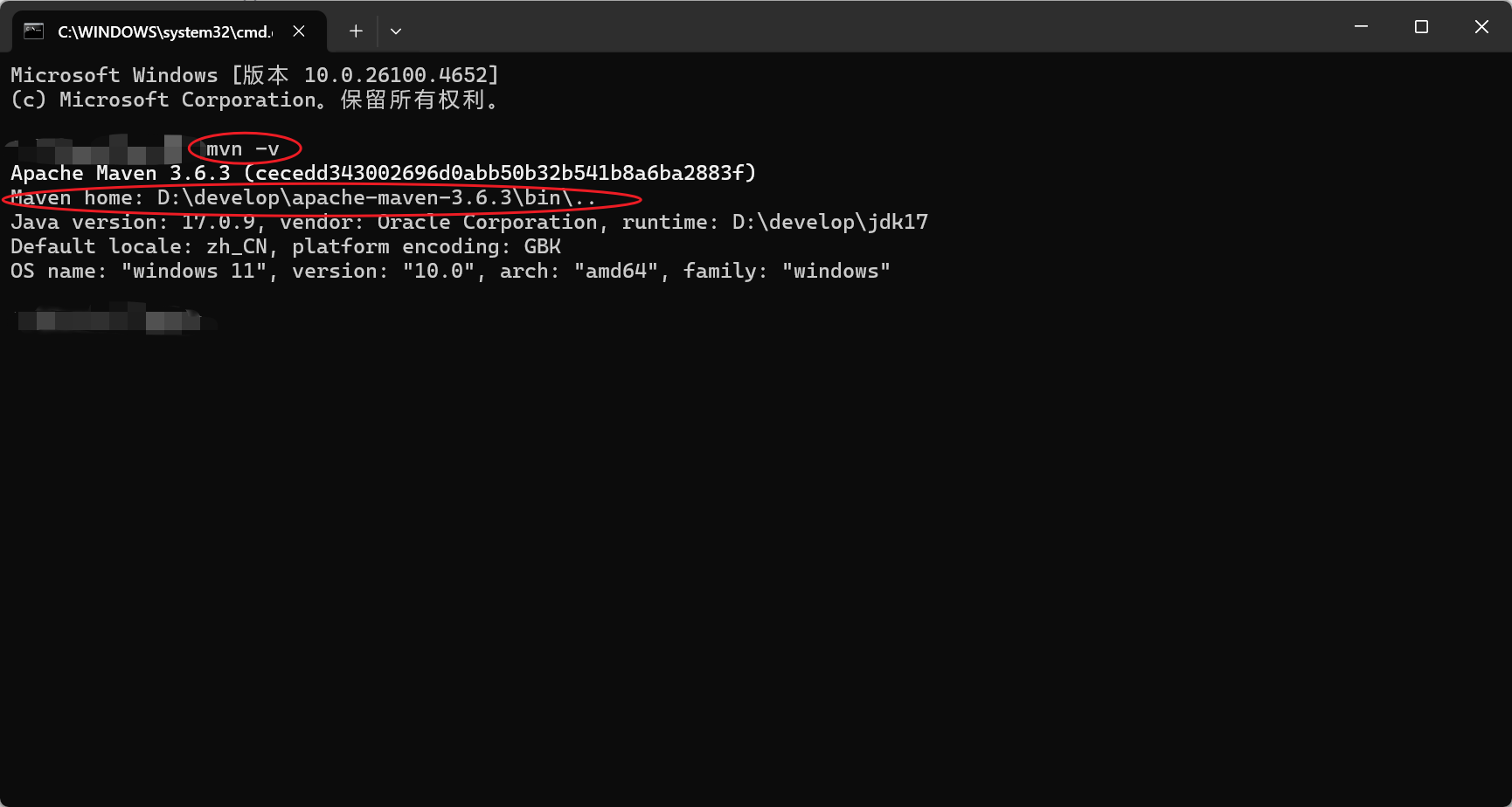 2)控制台页面输入mvn -v,出现maven版本信息,如下图,圈中所示,说明配置成功(不要忘记空格)