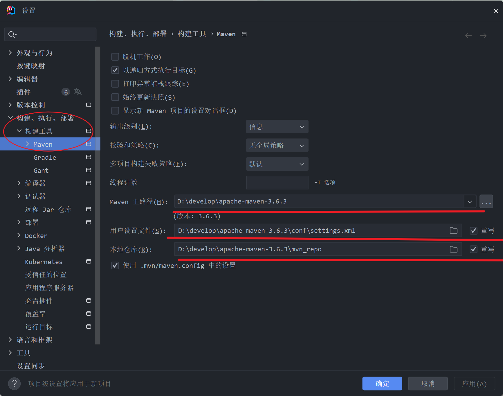 2.在构建、执行、部署 -> 构建工具 -> maven 中修改Maven主路径以及我们刚才配置好的settings.xml文件,以及本地仓库的位置,可以参照下图中的内容,进行选择。