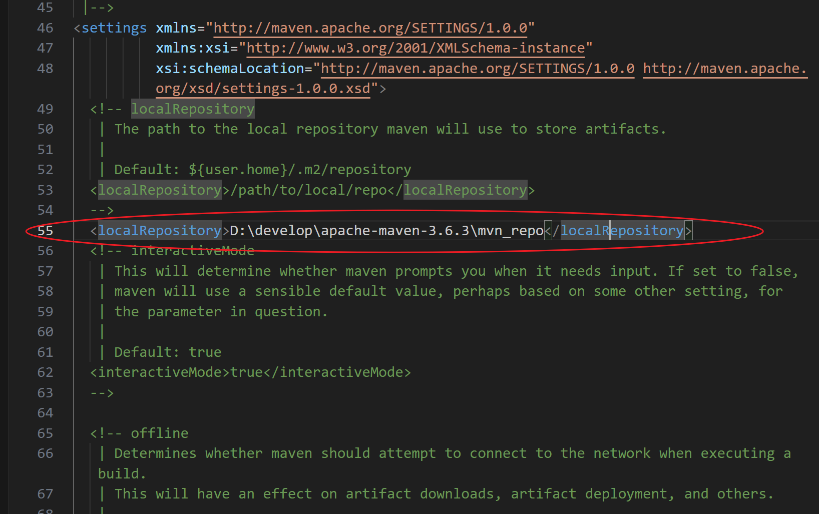 (3)修改设置,打开settings文件夹后,我们可以看到按照下图的方式,在<localRepository>标签对中,设置好我们刚才所创建的mvn_repo文件夹的路径