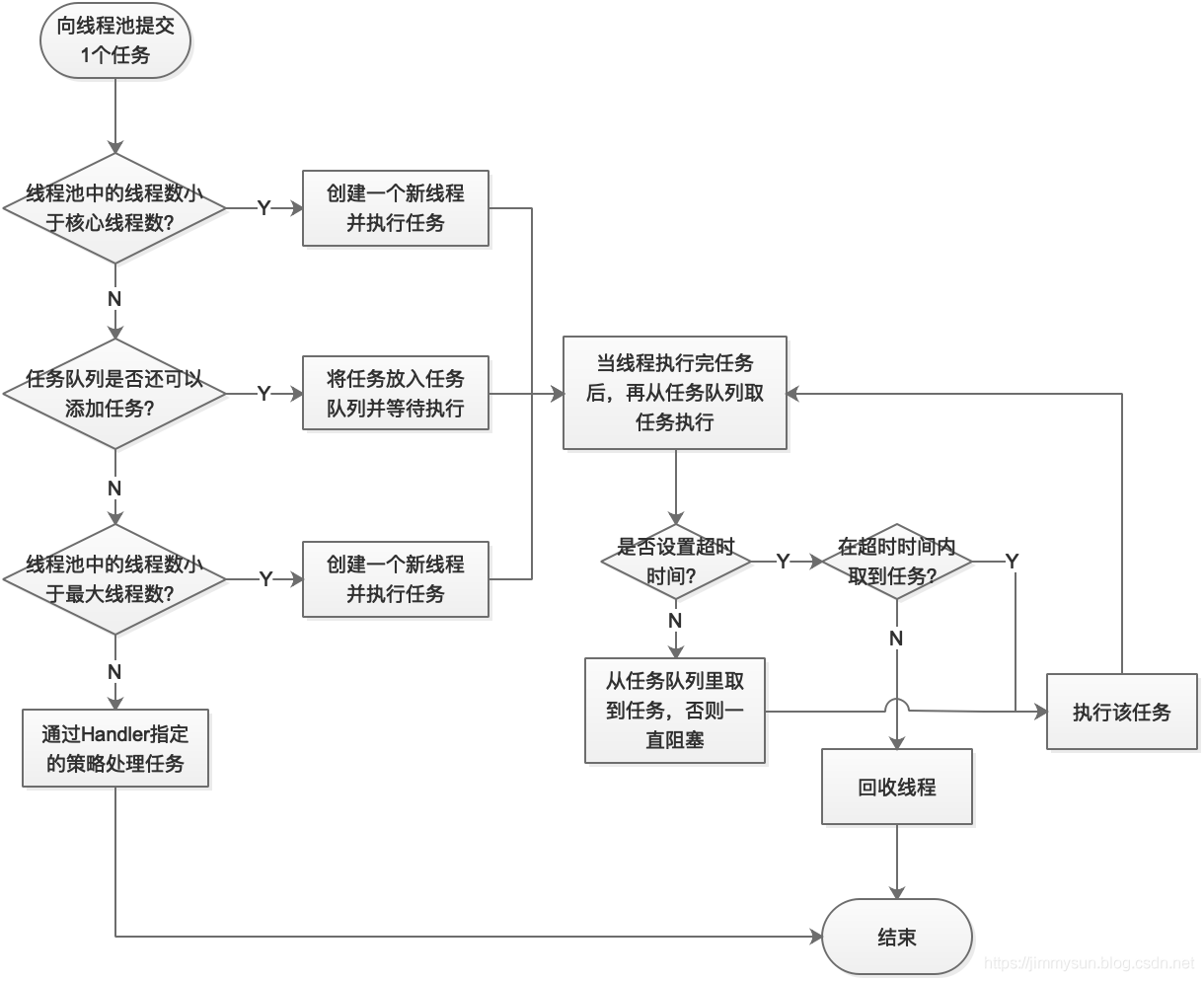 - 当前线程数达到corePoolSize后,如果继续有任务被提交到线程池,会将任务缓存到工作队列(后面会介绍)中。如果队列也已满,则会去创建一个新线程来出来这个处理。线程池不会无限制的去创建新线程,它会有一个最大线程数量的限制,这个数量即由maximunPoolSize指定。