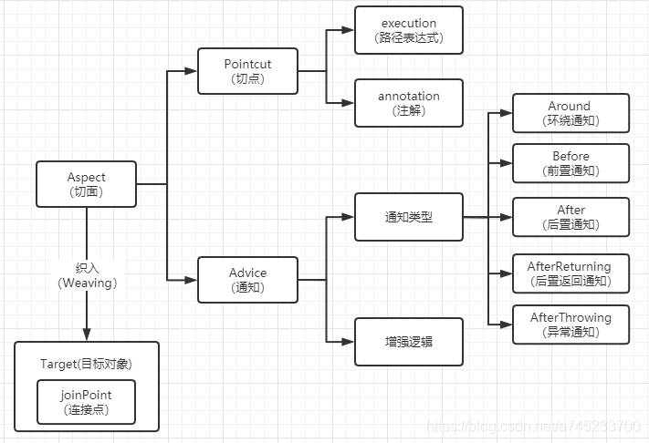 - 通过动态代理,在目标对象(Target)的方法(即连接点Join point)中执行增强逻辑(Advice)的过程。