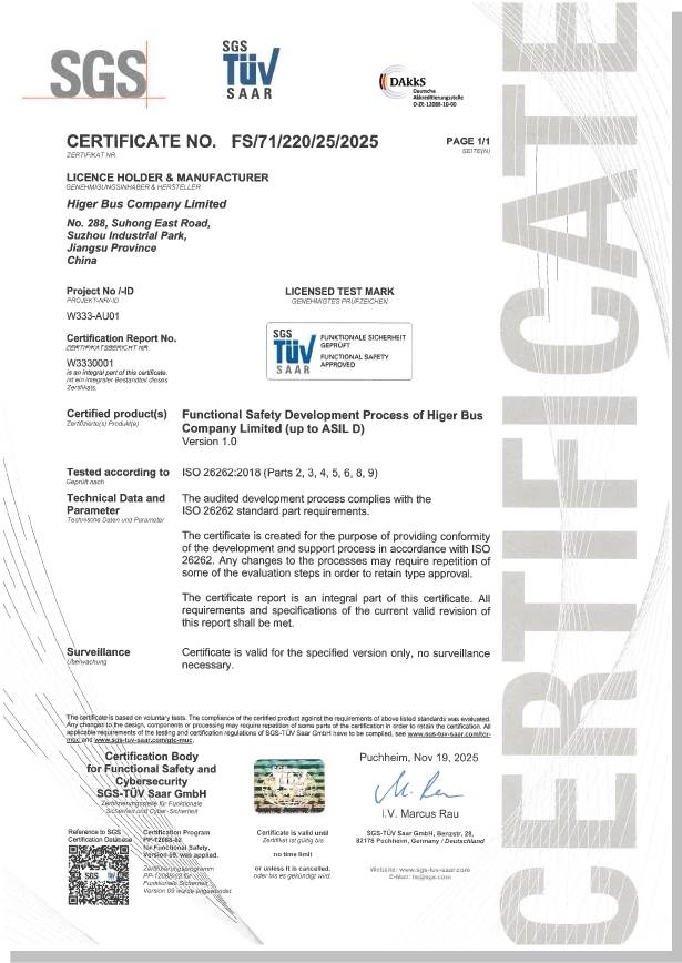 获得ISO 26262认证是苏州金龙在践行“安全为本”理念进程中的重要里程碑。未来,苏州金龙将继续深化功能安全体系的落地与实践,将其全面融入每一款产品的研发与制造环节,致力于以更高水平的安全、可靠与智能的客车产品,服务全球市场,切实履行保障公众出行安全的企业社会责任。