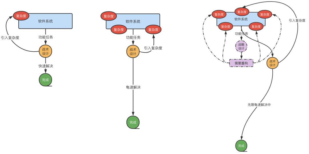 没有系统是天然复杂的,为了快速完成任务不断引入新的复杂度至系统逐渐腐化,无限增长与无限传递的复杂度让软件需求越来越难“快速完成”。当有一天我们意识到系统的复杂性时再试图通过战略设计进行软件的迭代,你会发现举步维艰,一处很小的修改需要投入大量的基建修复,最终我们不得不向成本低头,不断再通过战术设计无限的苟且。