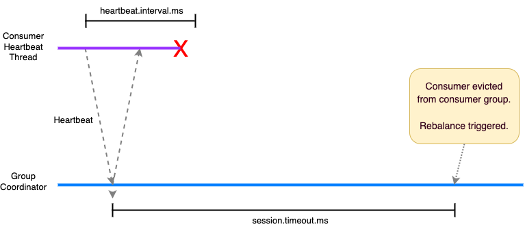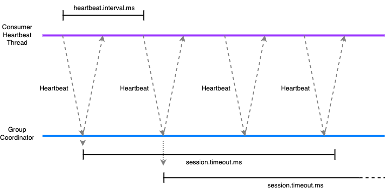 因此,有两个超时需要考虑,这与消费者何时被认为是健康的或失败并被逐出消费者组有关。如果主处理线程死亡,而心跳线程仍在运行,则通过超出max.poll.interval.ms来检测故障。如果整个应用程序死了,那么这将通过session.timeout.ms内没有收到心跳来检测。