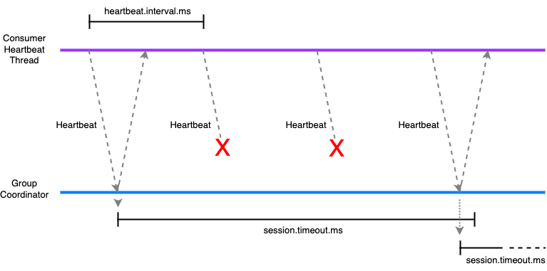 建议将heartbeat.interval.ms配置为不超过session.timeout.ms的三分之一。这确保了如果由于例如瞬态网络问题而丢失一两个心跳,则不会认为消费者失败。在此图中,有两个心跳丢失,但第三个在会话超时之前到达,因此 Group Coordinator 知道消费者仍然健康。