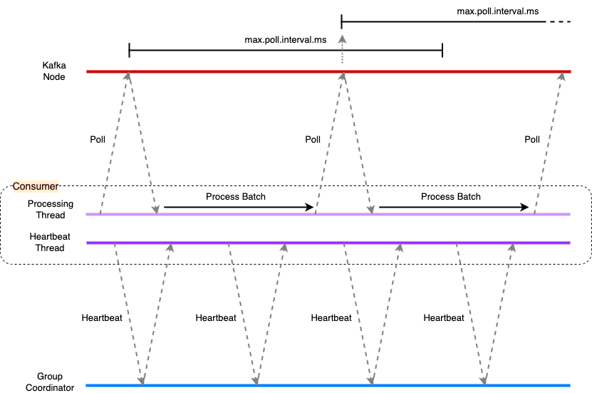 心跳在与主处理线程不同的线程上执行。消费者在主处理线程上轮询其主题分区,每次调用 poll() 都必须在配置的max.poll.interval.ms内发生。下图添加了消费者处理线程,显示了该线程的职责以及心跳线程的职责。