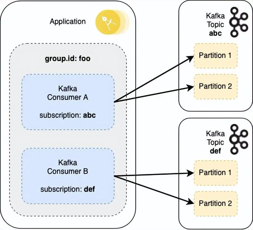 如果一个服务有多个订阅互斥主题但共享同一个group.id的消费者,那么任何一个消费者触发的rebalance仍然会影响组中的其他消费者。在以下场景中,消费者 A订阅了主题abc,而消费者 B订阅了主题def。他们在同一个消费者组foo中。如果消费者 A处理一个批次的时间过长并且超时,那么它将从消费者组中删除,从而触发rebalance。组中的所有分区分配都被撤销和重新分配,包括Consumer B的分配。