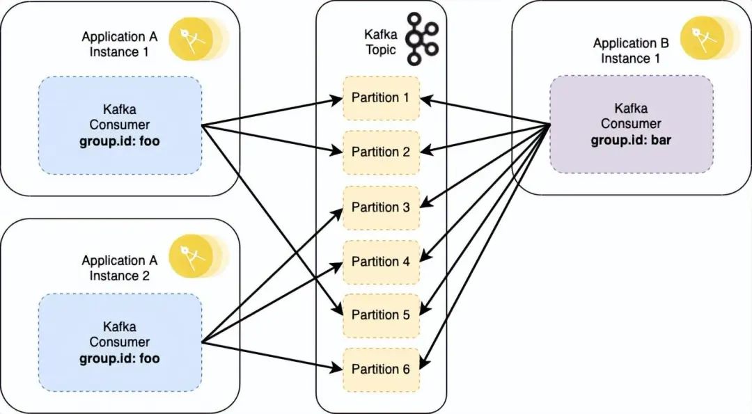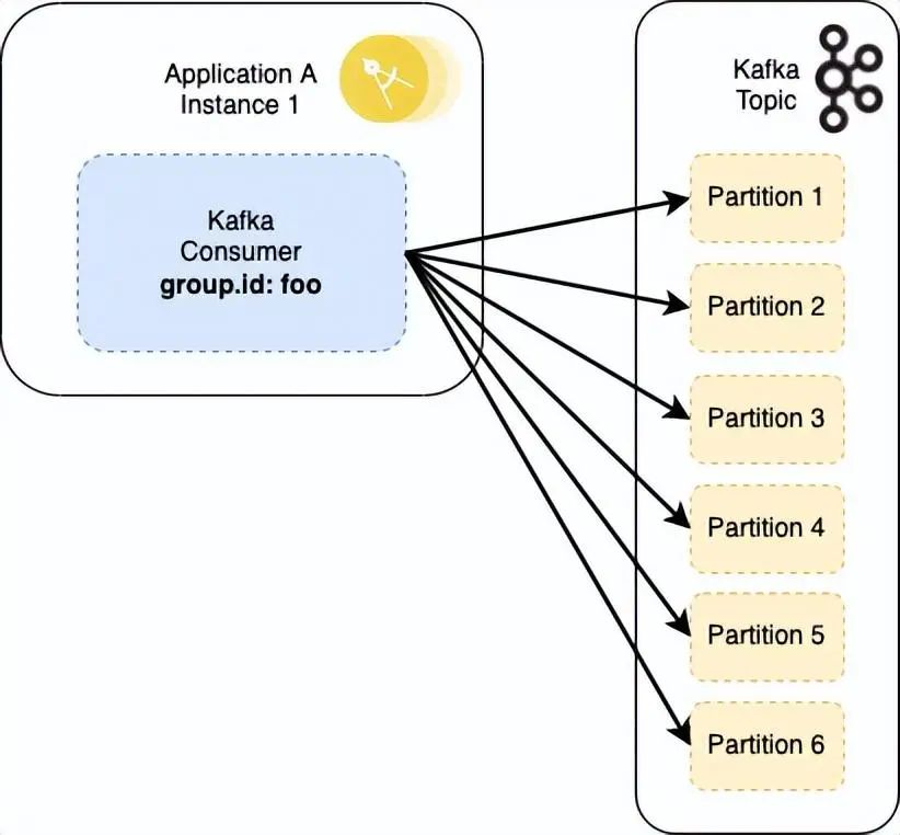 给定一个应用程序实例,其中group.id为 'foo' 的消费者正在监听特定主题,并且该主题有六个分区,然后消费者将轮询所有六个分区中的消息。
