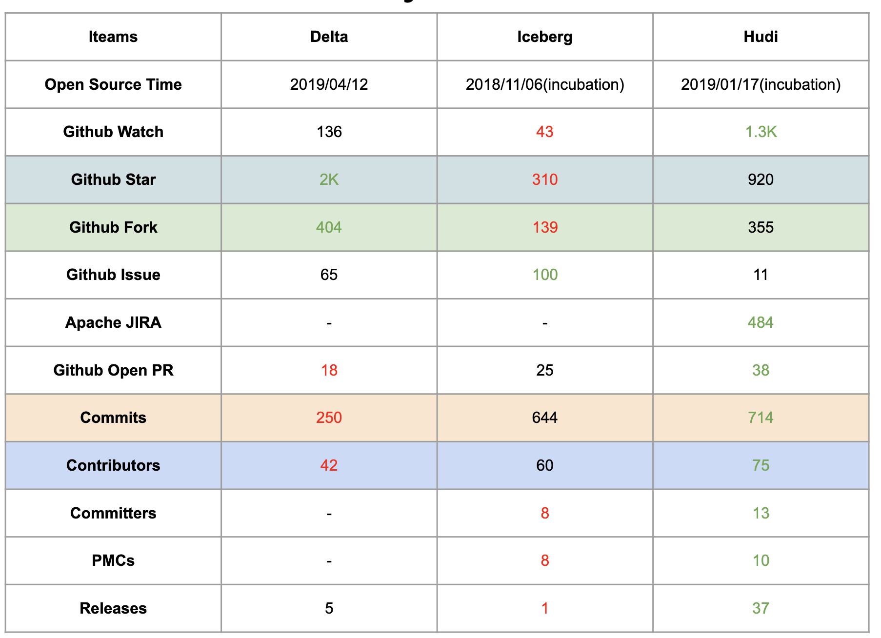 这里需要说明的是,Delta 和 Hudi 两个项目在开源社区的建设和推动方面,做的比较好。Delta 的开源版和商业版本,提供了详细的内部设计文档,用户非常容易理解这个方案的内部设计和核心功能,同时 Databricks 还提供了大量对外分享的技术视频和演讲,甚至邀请了他们的企业用户来分享 Delta 的线上经验。Uber 的工程师也分享了大量 Hudi 的技术细节和内部方案落地,研究官网的近 10 个 PPT 已经能较为轻松理解内部细节,此外国内的小伙伴们也在积极地推动社区建设,提供了官方的技术公众号和邮件列表周报。Iceberg 相对会平静一些,社区的大部分讨论都在 Github 的 issues 和 pull request 上,邮件列表的讨论会少一点,很多有价值的技术文档要仔细跟踪 issues 和 PR 才能看到,这也许跟社区核心开发者的风格有关。
