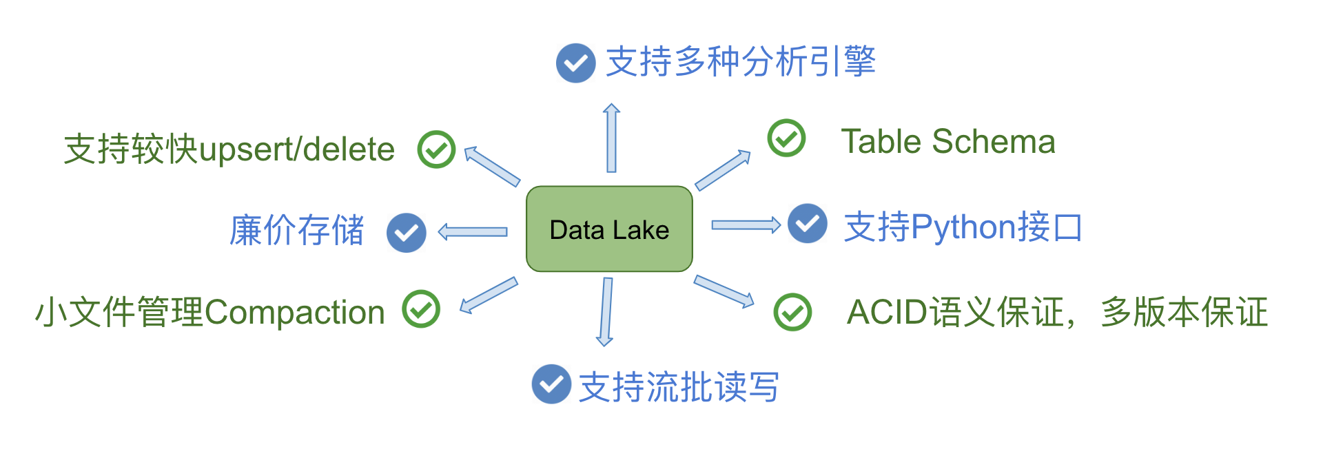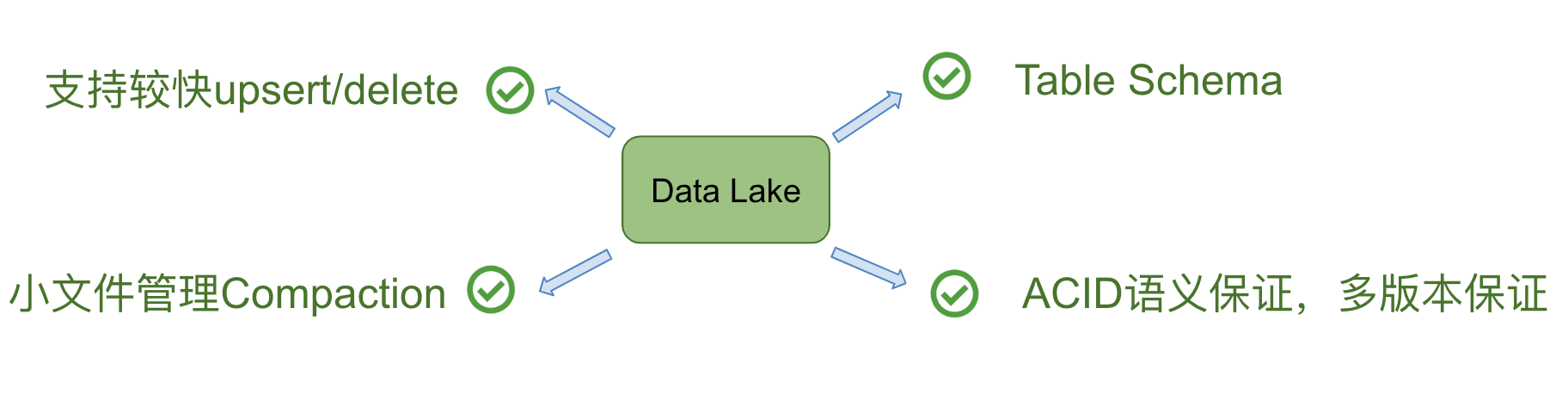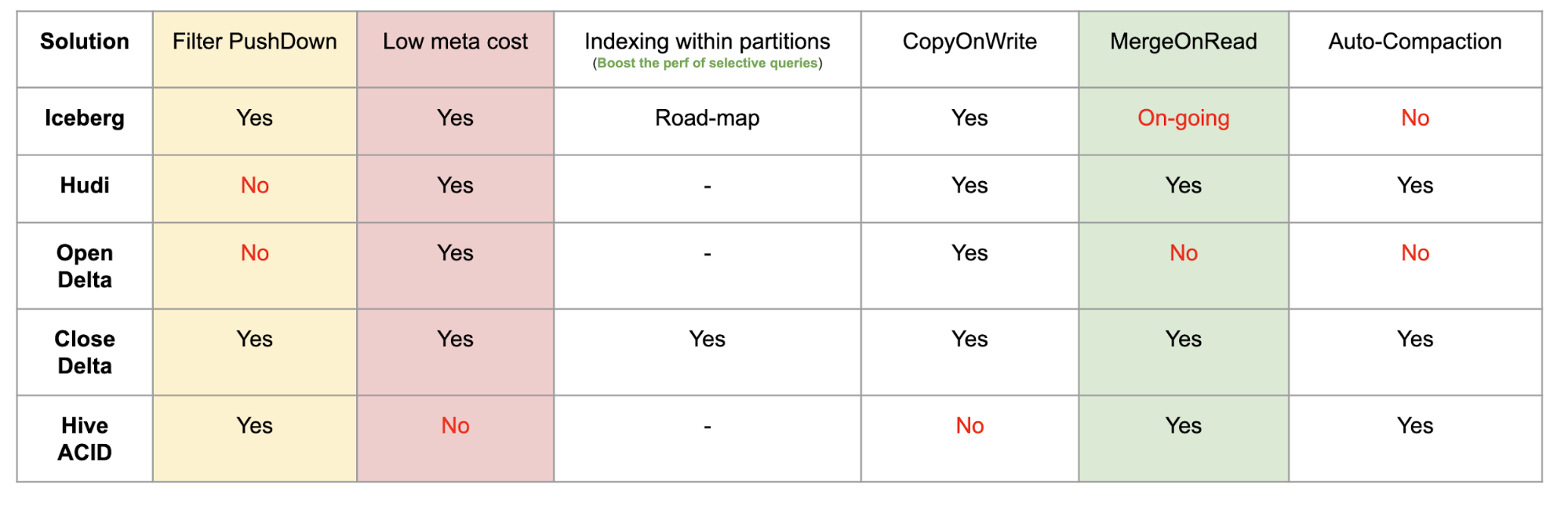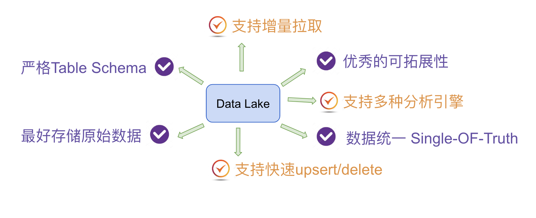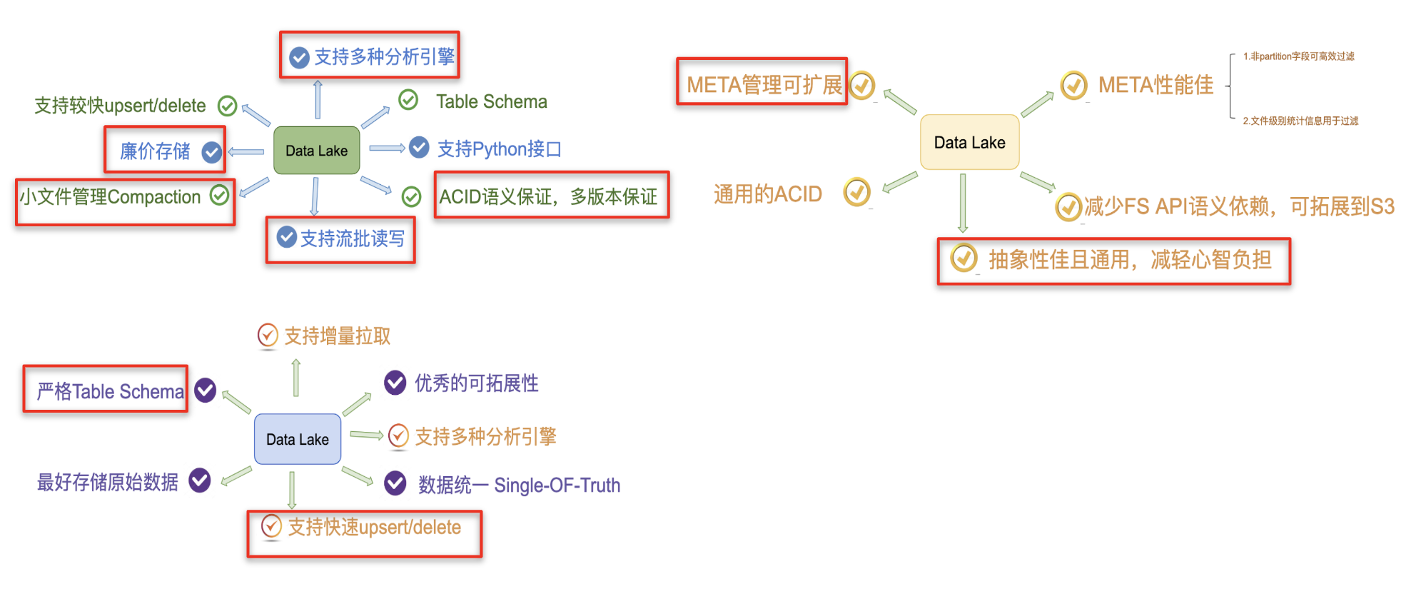 我们可以把上述三个项目针对的痛点,放到一张图上来看。可以发现标红的功能点,基本上是一个好的数据湖方案应该去做到的功能点。