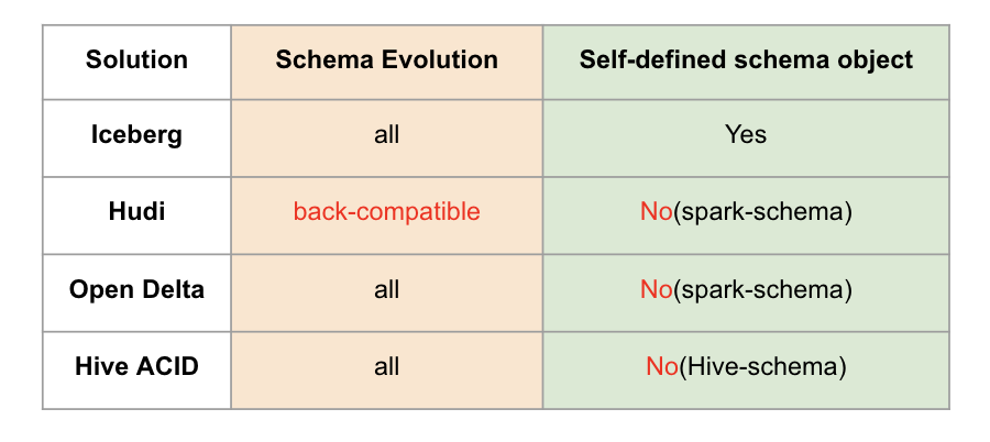 这里有两个对比项,一个是 schema 变更的支持情况,我的理解是 Hudi 仅支持添加可选列和删除列这种向后兼容的 DDL 操作,而其他方案则没有这个限制。另外一个是数据湖是否自定义 schema 接口,以期跟计算引擎的 schema 解耦。这里 Iceberg 是做的比较好的,抽象了自己的 schema,不绑定任何计算引擎层面的 schema。