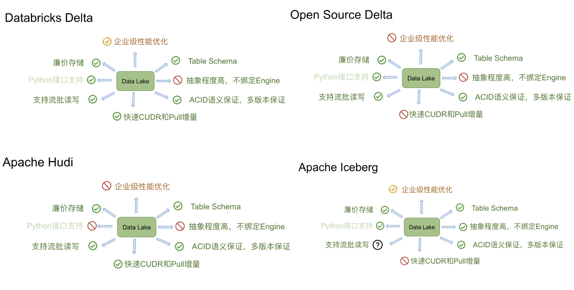 我们把三个产品(其中 Delta 分为 databricks 的开源版和商业版)总结成如下图: